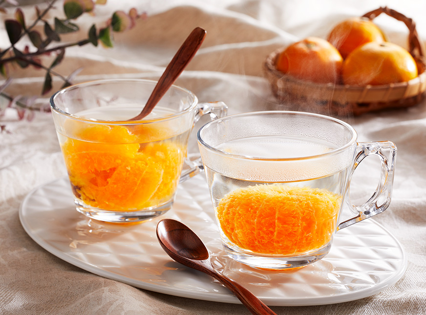 その後、冷水に取り出し、薄皮を丁寧に取り除く。 - グラスに焼酎甲類と(1)のみかんを入れ、熱湯を注ぐ。